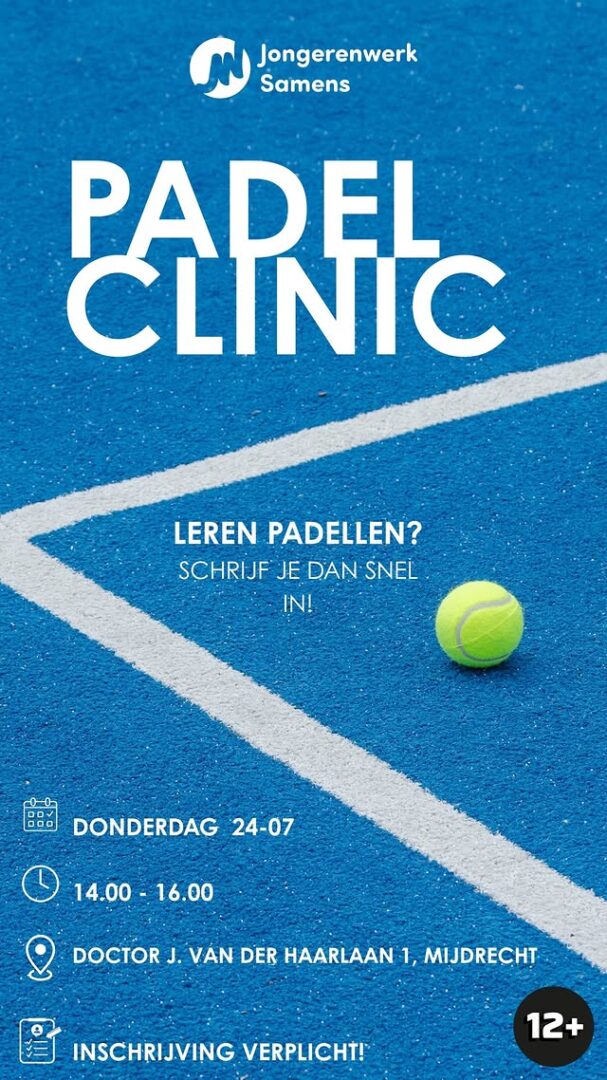 Padelclinic 24-07-2025 Wanneer 24-07-2025 14:00 - 16:00 Aan agenda toevoegen Download ICS Google Calendar iCalendar Office 365 Outlook Live Waar De Mijdrechtse Tennis & Padelvereniging Dr. J. van der Haarlaan 1 , Mijdrecht, 3641 JW Evenement type Je gezond voelen Vanaf 22 juli 2025 gratis activiteiten voor jongeren vanaf 12 jaar uit gemeente De Ronde Venen. Meer info? Locaties, tijden, aanmelden etc, bezoek onze socials of mail ons: jongerenwerk@stichtingsamens.nl Buurtkamer Vinkeveen viert 15-jarig bestaan 16-12-2025 Derde Kerstdag: Gezellige Kerstbrunch en Bingo in de Buurtkamer Mijdrecht 16-12-2025 Rollatorspreekuur 07-01-2025